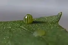 Los huevos son depositados individualmente en el envés de las hojas. El huevo es de color verde y con forma de barril con crestas longitudinales.