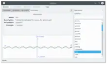 El diccionario incluye una lista exhaustiva de todas las funciones incorporadas en KAlgebra. Las funciones se pueden consultar con parámetros, ejemplos, fórmulas y gráficas de ejemplo. Soporta actualmente más de 100 funciones y operaciones.