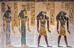 - Las salas gemelas K1 y K2, así como la última habitación (L) muestran más personalidades del extenso panteón egipcio, pero tampoco son fáciles de descubrir sus identidades. Al final de la tumba vuelven a aparecer partes del Libro de las Puertas, el texto al que más se recurre en toda KV11.