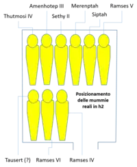 En el sarcófago de cuarcita todavía permanecía intacta la momia del rey, con una guirnalda de flores al cuello y así se mantuvo expuesta en el lugar hasta que en 1928 fue trasladada al Museo de El Cairo. No se sabe por qué los ladrones de tumbas antiguos respetaron el cuerpo del soberano, pues lo habitual es que las mutilaran e incluso destrozaran a la búsqueda de los amuletos y joyas que sabían que portaban entre las vendas.[1] Más tarde, la tumba fue utilizada como escondrijo de otras momias que fueron trasladadas aquí durante el Tercer periodo intermedio e identificadas por las inscripciones halladas en sus envoltorios funerarios. Pertenecen a las siguientes personas: