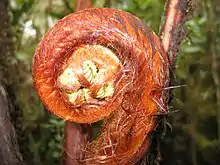 Hāpu'u'i'i, helecho arborescente hawaiano (Cibotium menziesii) en el Monte Ka'ala, O'ahu. Es endémica de las islas hawaianas y las frondas desenrolladas (violines) se comen hervidas. El núcleo de almidón de los helechos se utilizaba como alimento para cerdos.