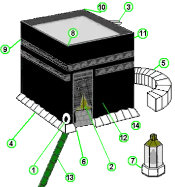 1. La Piedra Negra en la esquina sureste. En 684 la piedra se resquebrajó a causa del calor provocado por un incendio. En 930 la tomaron como botín los cármatas en su ataque a La Meca. Fue restituida en 950.