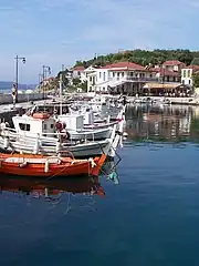 En los meses de verano un servicio regular de ferry une la isla con el puerto de Mitikas en el continente.