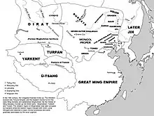 Los Oirat eran originarios del área de Tuvá a principios del siglo XIII. Su líder, Quduqa Bäki, se sometió a Genghis Khan en 1208 y su casa se casó con las cuatro ramas de la línea Genghisid. Durante la guerra civil Toluid, los Cuatro Oirat (Choros, Torghut, Dörbet y Khoid) se pusieron del lado de Ariq Böke y, por lo tanto, nunca aceptaron el gobierno de Kublaid. Después del colapso de la dinastía Yuan, los Oirat apoyaron al Ariq Bökid Jorightu Khan Yesüder para apoderarse del Yuan del Norte.trono. Los Oirat dominaron los Yuan khans del norte hasta la muerte de Esen Taishi en 1455, después de lo cual emigraron al oeste debido a la agresión mongola de Khalkha.[2] En 1486, los Oirat se vieron envueltos en una disputa sucesoria que le dio a Dayan Khan la oportunidad de atacarlos. En la segunda mitad del siglo XVI, los Oirats perdieron más territorio frente a los Tumed.[3]