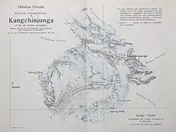 - 1899 El explorador británico Douglas Freshfield y el fotógrafo italiano Vittorio Sella fueron los primeros en rodear la montaña, siendo los primeros exploradores que contemplaron la gran cara Oeste del Kanchenjunga.[7]
