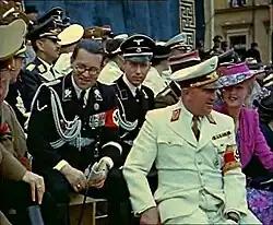 ![]() (desde la izquierda) Philipp Bouhler, Karl Freiherr Michel von Tüßling (centro), Robert Ley con su esposa Inga; Múnich, julio de 1939. | ||
