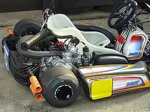 Un go-kart es un kart a motor sin techo o cockpit, en el que las dos ruedas traseras están conectadas por un eje de una pieza que transmite la potencia de un motor.