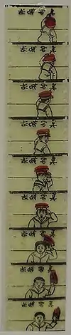 Matsumoto descubrió la tira de Katsudō Shashin,[22] que no se había conservado en buenas condiciones.[23] Habida cuenta de las fechas de manufactura de los proyectores de Kioto, Matsumoto y el historiador Nobuyuki Tsugata[lower-alpha 7] llegaron a la conclusión de que el filme databa de la era Meiji, entre los años 1907 y 1911.[lower-alpha 8][24][25] El historiador Frederick S. Litten sugirió 1907 como factible,[26] y que «una fecha de producción anterior a 1905 o posterior a 1912 es poco probable».[27] Consideró imposible la creación de la película después de 1912, porque el precio del celuloide aumentó a partir de la Primera Guerra Mundial y la elaboración de tales cortometrajes ya no habría sido rentable.[27] Otras fuentes, como China Daily, especularon un período anterior a 1907, pero no se basaron en ninguna base científica, sino que incluso contradijeron la investigación publicada.[28] En esa época existían muy pocas salas de cine en Japón,[3] por lo que se cree que se trataba de un artículo que era producido en serie y vendido a un precio elevado, por lo que solo aquellos clientes que contaran con su propio proyector en casa podían disponer del material.[21] Según Matsumoto, la cinta podría provenir de una empresa pequeña, dada la mala calidad de la tira y su rudimentaria técnica de impresión.[27] Se desconoce aún el creador de la animación.[22]