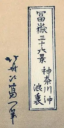 - En el cartucho, el título de la tabla en la parte superior: «冨嶽三十六景 / 神奈川沖 / 浪裏» significa «Fugaku sanju-rokkei / Kanagawa-oki / nami-ura», «Treinta y seis vistas del monte Fuji»/ desde Kanagawa / sobre la ola». La firma en la parte superior en la izquierda de la caja hay escrito: «北斎改為一筆», «Hokusai aratame Iitsu hitsu».