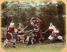 Escenificación de un combate samurái, c. 1880, copia a la albúmina coloreada.