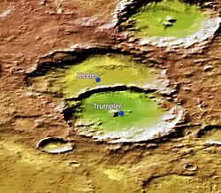 Imagen MOLA que muestra la relación entre los cráteres Wright, Keeler y Trumpler. Los colores indican elevaciones.