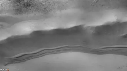 ![]() Ampliación de las dunas a lo largo de la pared norte del cráter Trumpler (parte inferior de la imagen de la izquierda) |
