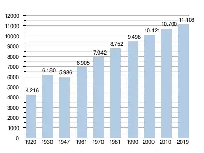 Todos los datos históricos relativos al actual municipio, el siguiente gráfico refleja su evolución demográfica, incluyendo municipios después de efectuada la fusión el 1 de enero de 1977.