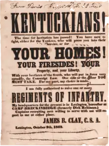 En lo político, la Commonwealth había producido algunos de los líderes más conocidos del país. Los exvicepresidentes John C. Breckinridge y Richard Mentor Johnson ambos procedían del Estado de Bluegrass, así como Henry Clay, John J. Crittenden, el Presidente de los Estados Unidos Abraham Lincoln, y el Presidente confederado Jefferson Davis.[6] Sin embargo, en el momento de la Guerra Civil, Kentucky era un estado políticamente confuso. La disminución del Partido Whig, que Clay había fundado, había dejado a muchos políticos en busca de una identidad. Muchos se unieron al Partido Demócrata, unos pocos se unieron al Partido Republicano recién formado, mientras que otros se asociaron con uno de los numerosos partidos menores tales como el Partido no sabe nada. En las elecciones presidenciales de 1860, el Partido de la Unión Constitucional, con el nativo de Tennessee John C. Bell como su candidato presidencial y el nativo de Massachusetts Edward Everett como su candidato a la vicepresidencia, ganó el estado. El partido estaba compuesto principalmente por ex Whigs y No Sabe Nada.[7]