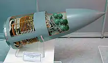 - Kh-31P (Tipo 77P)[13] (Type 77P):[7] cabeza de buscador pasivo para usar como un misil antirradar. Permanece a gran altura durante todo su vuelo, lo que permite velocidades más altas y un alcance cada vez mayor a 110 km. El buscador tiene tres módulos intercambiables para cubrir diferentes bandas de frecuencia de radar,[14] pero solo se pueden cambiar en la fábrica.