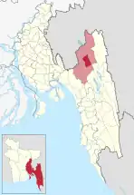 Se encuentra ubicado al sureste del país, cerca de la frontera con India, de los ríos Chengi, Feni y Maini, y del lago Kaptai.