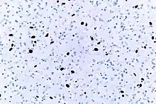 Recuento de núcleos positivos frente a negativos con marcaje Ki-67, en este caso en un tumor neuroendocrino de intestino delgado. Para contar como positivo, un núcleo debe tener una tinción oscura homogénea (no solo punteada), al menos la mitad dentro del campo de visión, ser lo suficientemente grande y no estar ubicado en el estroma.