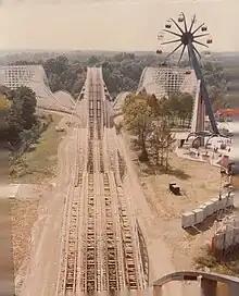 La atracción estrella del parque era The Racer, una montaña rusa de madera de dos pistas paralelas diseñada por John Allen.