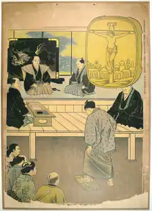 En la primera mitad del siglo XVII el shogunato exigió la expulsión de todos los misioneros europeos y la ejecución de todos los conversos.[27] Esto marcó el fin de la apertura al cristianismo en Japón. El bakufu hizo tablones de anuncios en todo el país en encrucijadas y puentes, entre las muchas prohibiciones que figuraban en estas tablas había advertencias estrictas contra el cristianismo.[28]