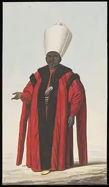 Los titulares de la oficina, como la mayoría de eunucos negros en general, eran Habeşi, esclavos tradicionalmente procedentes de los pueblos niloticos que habitan el sur de Etiopía, así como de los pueblos omóticos también de esa región. Los esclavos negros, normalmente comprados niños en Nubia, castrados e incorporados al servicio de palacio, habían empezado a ser empleados como guardias de las mujeres del harén del sultán desde la época del predecesor de Murad III, Selim II (r. 1566–1574), y continuaron siendo empleados hasta el fin del imperio otomano.[3] Los eunucos recibían normalmente nombres de flores, y después de un periodo de entrenamiento en la escuela de palacio, ingresaban al servicio del harén. Los eunucos empezaban en el puesto de recluta ordinario (en unşunğı, literalmente "el más bajo", y acemi unğun, "el no entrenado"), y ascendían gradualmente a través de varios rangos, desde nevbet kalfa ("sustituto del reloj") a puestos veteranos en la guardia del harén.[7][8][9] Habiendo completado su formación y después de un periodo de servicio, algunos eran retirados de los deberes de guardia y transferidos a la atención de los habitantes del harén: los asistentes personales del sultán (müsahip unğaları), los siete sirvientes eunucos más un eunuco jefe (baş unğun) adjunto a cada valide, esposa principal (kadın), o príncipe (şehzade), los imanes eunucos que dirigían las oraciones del harén, el tesorero del harén (haznedar unğcuandoı), o el müsendereci, que supervisaba el trabajo de los otros eunucos. La mayoría de eunucos mayores eran conocidos como haıllı, una palabra de origen árabe que significa "mercancía".