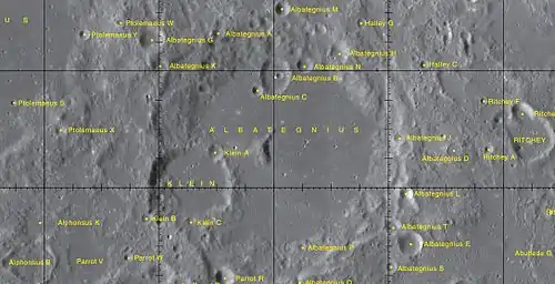 Por convención estos elementos son identificados en los mapas lunares poniendo la letra en el lado del punto medio del cráter que está más cercano a Klein.