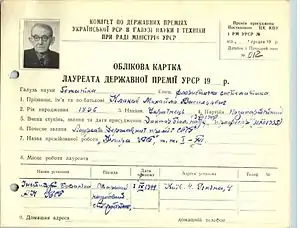 ![]() Tarjeta civil, como ganador del Premio Estatal de la URSS, del autor | ||