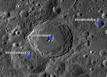 Por convención estos elementos son identificados en los mapas lunares poniendo la letra en el lado del punto medio del cráter que está más cercano a Kovalevskaya.