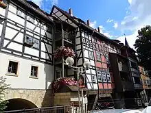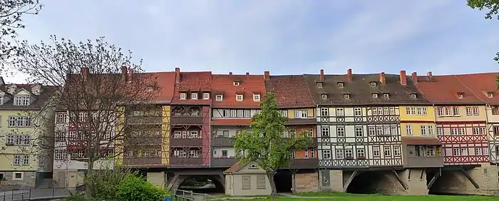 En 1486 concluyó la construcción de las viviendas del Krämerbrücke, tras el incendio de 1472 que destruyó cerca de la mitad de la ciudad y los puestos del mercado instalados sobre el puente de piedra.[4][7] A cada lado del puente de piedra se construyeron 62 edificios con entramado de madera, formando una calle entre las dos hileras.[7] Con el paso de los siglos, los pequeños edificios se fueron fusionando, de forma que en la actualidad se contabilizan 32 casas sobre el puente. En las plantas bajas hay locales comerciales y las superiores son viviendas.[9] Constituyen las hileras de edificios habitados sobre un puente más largas de toda Europa.[10]