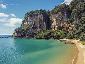 Las rocas de la playa de Railay, cerca de Ao Nang, han atraído a escaladores de todo el mundo y cada año son el escenario del Festival de la Roca y el Fuego a mediados de abril. Hay varias escuelas de escalada en la playa de Railay. La roca es de piedra caliza y tiene característicos bolsillos, salientes y caras. Railay tiene numerosas zonas de múltiples emplazamientos, la mayoría de los cuales parten de la propia playa. Un ejemplo famoso es la "Humanidad". Además, la escalada en aguas profundas es muy popular en las numerosas islas rocosas cercanas a las que se puede acceder en barco de cola larga. Otro destino popular es la Playa de las Conchas Fósiles, situada en Ban Laem Pho. La playa es famosa por sus conchas de caracol fosilizadas, habitantes del pantano de agua dulce que cubría esta zona hace unos 40 millones de años.