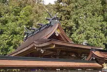 Los adornos de bronce en la parte superior del tejado son característicos de la arquitectura de santuario. Las piezas transversales en forma de X que perforan el cielo se llaman chigi y las vigas de troncos que se colocan horizontalmente a lo largo y perpendicular a la línea de cresta se llaman katsuogi. Esta combinación añade un toque dramático a la línea del tejado.