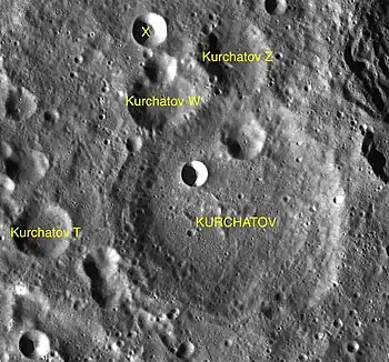 Por convención estos elementos son identificados en los mapas lunares poniendo la letra en el lado del punto medio del cráter que está más cercano a Kurchatov.