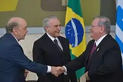 ![]() Amiridis (derecha) presentando sus cartas credenciales ante Michel Temer. | ||