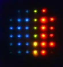- 3. Cada haz resultante pasa por la celda de cristal líquido, al pasar por el cristal líquido este cambia su longitud de onda, de manera que su color variará en función de la orientación del cristal líquido en el punto en que es atravesado por cada flujo láser.