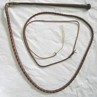 Esto permite que el látigo cuelgue a través del brazo de un ganadero cuando no es utilizado. Las mancuernas normalmente son más largas que las de un látigo de toros, oscilando entre 30 y 50 cm (15 y 21 pulgadas) de longitud. La longitud de la correa puede extenderse a partir de 0,9 a 3 metros (3 pies a 10 pies). En Australia, los látigos de ganado se hacen casi exclusivamente de piel curtida de canguro.