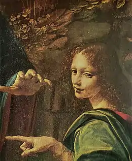 ![]() Retrato del arcángel Uriel, detalle de la Virgen de las rocas, presentado en la cubierta de la edición italiana, y en la contracubierta de la edición en castellano. | ||