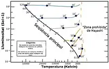 Un diagrama de Hertzsprung-Russell muestra un gráfico de la superficie de la estrella relacionando temperatura con luminosidad. Sobre este diagrama, el límite de Hayashi aparece como una línea casi vertical aproximadamente a 3,500 K. Estrellas de temperatura baja siempre son totalmente convectivas, y los modelos de estructura estelar para estrellas totalmente convectivas no brindan una solución a la derecha de esta línea, donde una estrella se encuentra en equilibrio, con menores temperaturas superficiales. En consecuencia las estrellas están limitadas a permanecer a la izquierda de este límite durante todos los períodos en los que están en equilibrio hidrostático, y la región a la derecha de la línea forma una especie de «zona prohibida». Nótese, sin embargo, que existen excepciones al límite de Hayashi, entre las que se encuentran protoestrellas en colapso, así como estrellas con campos magnéticos que interfieren en el transporte interno de energía a través de la convección.[2]