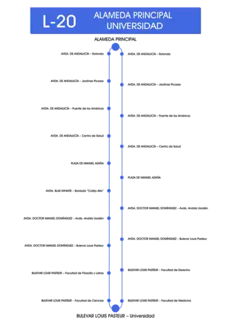 Desde la primera parada, toma el bulevar de Louis Pasteur y a la altura de Gregorio Prieto gira a la derecha hasta el final. En la rotonda, gira a la izquierda para incorporarse a la Avenida Blas Infante. Llega a la Plaza de Manuel Azaña y desde ahí continúa por la Avenida de Andalucía, hasta el final de la calle para acabar su recorrido en la Alameda.