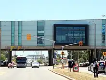 Línea 214 circulando por debajo del Costa Urbana Shopping sobre la Avenida Luis Giannattasio.