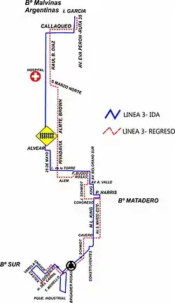 IDA: Castex, Varela, Unanue, González, Rosas, Tita Merello, Constituyentes, King, Harris, Avda. Aristobulo del Valle, Avda. Belgrano (S), Lisandro de la Torre, 25 de mayo, Alvear, Callaqueo, Avda. Eva Perón