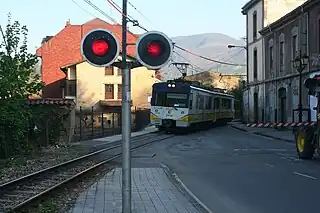 ![]() Automotor de la serie 3300 circulando por la línea C-6f en Infiesto | ||