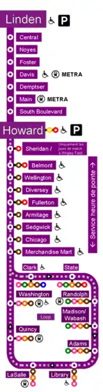 La línea Púrpura (en inglés: Purple line) del Metro de Chicago comúnmente conocido como Chicago "L", consiste en 27 estaciones en horas pico, y 9 regularmente. La línea inicia en la estación Linden en Wilmette a la estación Howard y en el The Loop de lunes a viernes solamente, al norte en los límites municipales de Chicago. La línea fue inaugurada el 16 de mayo de 1908.