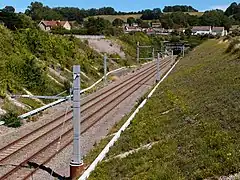 La línea entre Wootton Bassett y Cardiff Central se ha electrificado mediante el sistema aéreo de CA de 25 kV, como parte de la electrificación más amplia de la Línea Principal del Great Western.