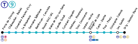 La Línea T9 de tranvía es una línea de la red de Tranvía de la Île de France, que transcurre a lo largo de la carretera departamental nº 5 (antigua RN-305) sustituyendo a la línea de autobús 183 de la RATP. Une Porte de Choisy (París) a Orly. Entró en servicio el 10 de abril de 2021.