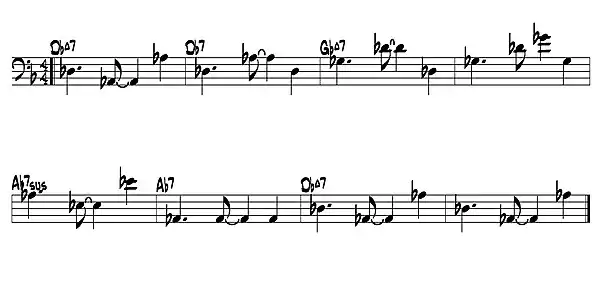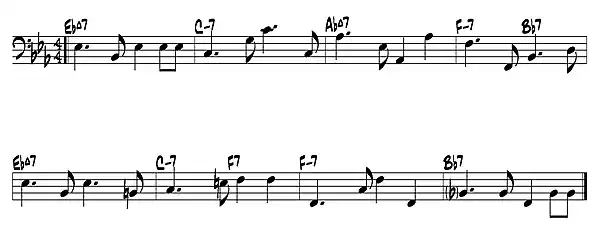 - Línea de bajo sobre un bolero lento. Desde el punto de vista armónico es destacable el uso del patrón tónica / quinta, similar a las líneas típicas de la bossa nova.