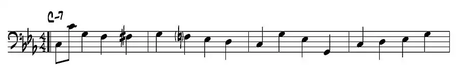- Walking "a cuatro" sobre un acorde C-7. Común durante la ejecución del solista o temas rápidos. Nótese cómo el bajo delinea la armonía mediante notas relativas al arpegio (C menor) y a la escala (C dórica):[7]