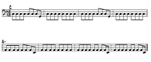 - Sencilla línea rock sobre power chords, caracterizada por el uso de corcheas y por el énfasis en la fundamental de cada acorde.
