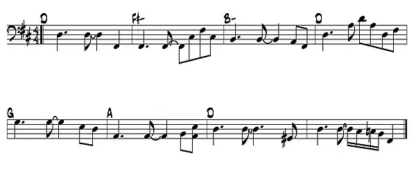 - Línea de bajo sobre una progresión de acordes tríada en la tonalidad de Re Mayor. Nótese el patrón rítmico estándar entre el bajo y el bombo y los fills (rellenos o motivos decorativos) de los compases 2, 4 y 8.