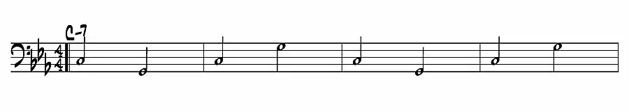 - Walking "a dos" sobre un acorde C-7. De uso generalizado en baladas o como acompañamiento para la melodía. Nótese como el bajo emplea un patrón tónica-quinta (C-G)