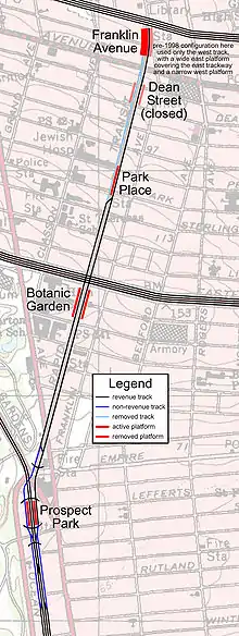 Después de Park Place, la línea se amplía de una a dos vías y el derecho de paso con la reconstrucción de 1999, volvió a tener el mismo estilo del que tenía en 1878, incluyendo los estilos antiguos de vías del túnel bajo Eastern parkway, en el extremo sur en la cual es ahora la nueva estación del Jardín Botánico de 1928.
