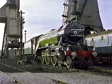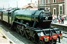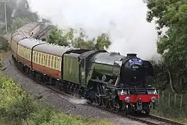![]() Flying Scotsman en el Ferrocarril West Somerset el 11 de septiembre de 2017, con la librea de color verde del BR, sus prominentes deflectores de humo de estilo alemán, y su doble chimenea | ||